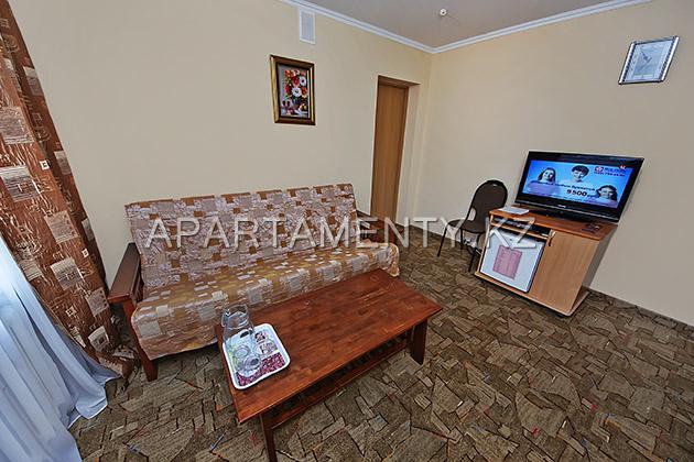 Modern renovated, stylish furniture, a double bed, sofa, coffee table and desk, suitcase stand, bedside tables, dressing table, a wardrobe with a coat hanger, slippers and shoe shine. Fire alarm, air conditioning, LCD TV with the function of USB, cable TV, DVD, free wireless Internet access, mini fridge, radio, telephone. In the bathroom - bath robe and toiletries, hair dryer, radio, telephone.