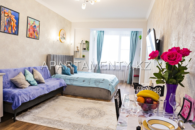 Cozy, bright studio with a view of the mountains and lake "Sairan.“ Check-in time is from 14-00, check-out time is 11-00 h. The apartment has everything you need for a comfortable stay for both short and long term: white towels, disposable toiletries, electric stove, oven, microwave, dishes, kettle, frying pan, pots, tea, coffee, sweets, bottled water (included in the price), iron, hairdryer, ironing board, W-Fi, smart TV, Netflix subscription. There is a separate workplace if you work remotely. Access to the apartment is carried out by means of a digital lock. The apartment has a spacious bed and a pull-out sofa, which can accommodate a family of 4 people. Smoking and noisy parties are prohibited indoors. There is a refundable deposit equal to 15,000 tenge, which is returned in full upon departure, subject to the rules of accommodation (no smoking, no noise). If you need a clean, well-groomed, cozy studio, then we are waiting for you as guests of our house!