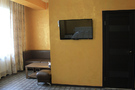 Люкс оборудован двухспальной кроватью, мягким уголком с журнальным столом, телевизором со спутниковыми каналами, банными халатами с одноразовыми тапочками и необходимыми мыльными принадлежностями.